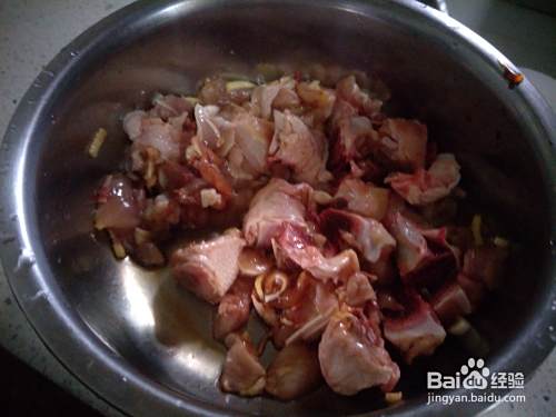 把鸡腿上的肉用刀踢下来,切成大小适宜的丁儿,装碗里,加上姜,蒜,酱油,食用盐,芝麻油,搅拌均匀备用。