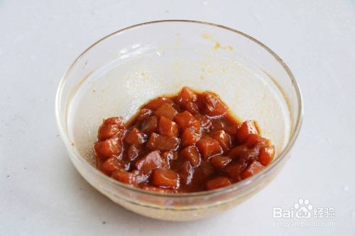 瘦肉洗净,切成小颗粒;肉丁放碗里,放入1小勺生抽、3/1勺盐、1勺淀粉,1小勺色拉油抓均匀,静置15分钟;
