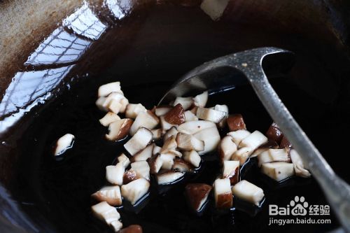 锅内倒入少量的色拉油,油热后加入肉粒,翻炒变色出锅;另起锅,倒入少量的色拉油,倒入香菇翻炒至变色后;