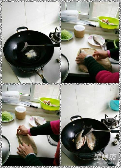 1把鱼洗干净,自然风吹干,这个还有点湿,老妈把鱼放抹布上醮干,姜切片,锅烧热,放姜片,出香味后,把鱼放进锅里(应该在鱼身上拍点面粉的,这步我和老妈都忘了)