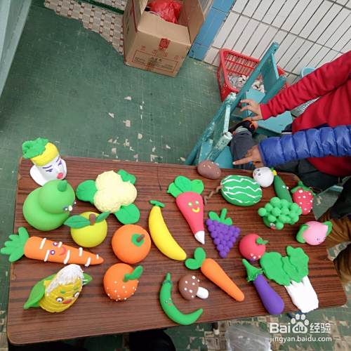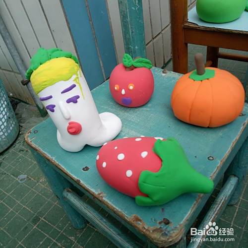 第五步:如图所示,有萝卜星巴苹果,南瓜还有草莓。其实做做这一些粘土作品是比较简单的,大家可以打印一些图片,然后让动手制作也锻炼了小朋友的动手能力。