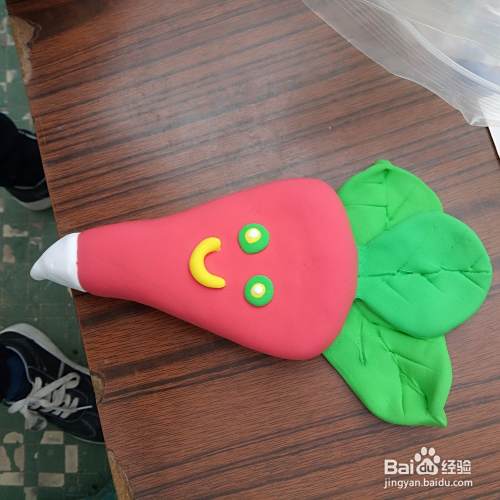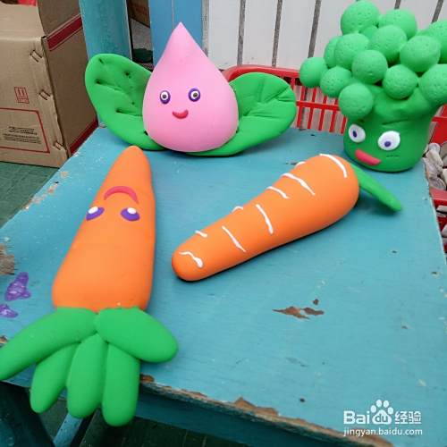 第四步:用粘土制作好红萝卜胡萝卜。桃子如图所示,粘土在制作这一些水果蔬菜时可以进行揉搓,会让粘土更加的光滑!