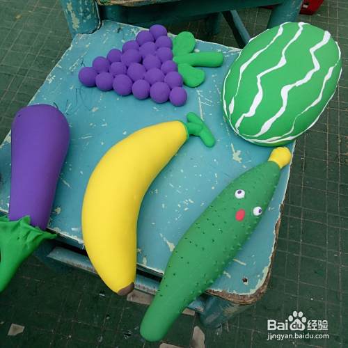第一步:在楼梯墙面上来来进行放置手工制作粘土的作品那肯定避免不了粘土作品。如图所示,下图有几种水果的成品有黄瓜,香蕉,茄子,葡萄西瓜。大家需要准备好大包的粘土,来进行手工制作。可以参考图片。