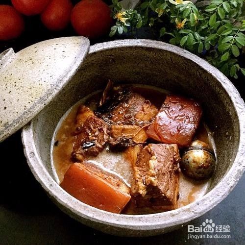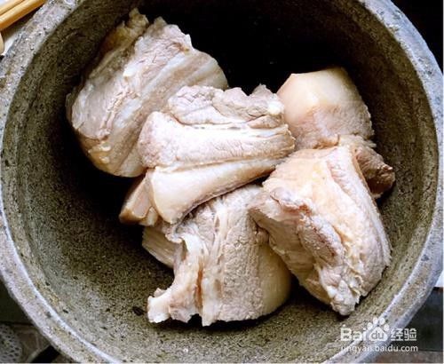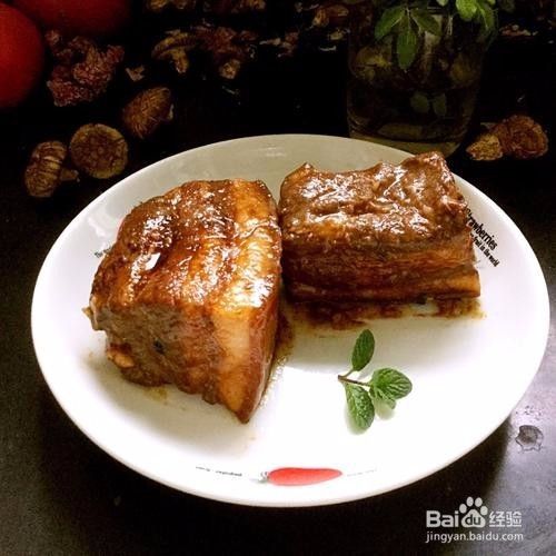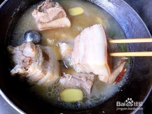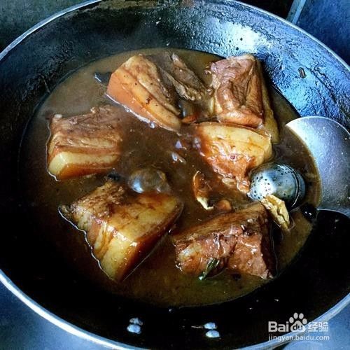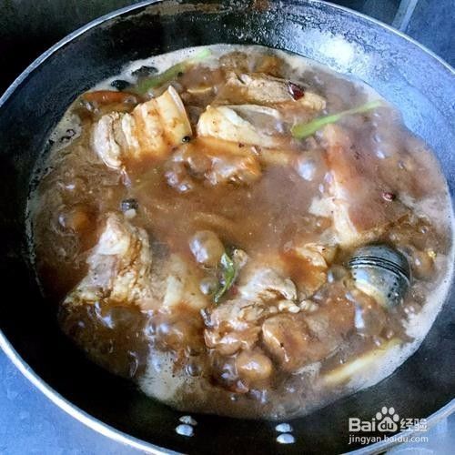 9、煮的过程中,可将五花肉翻个,并将汤汁浇在肉上,以便入味,炖煮约四十分钟,汤汁收的剩下有一半即可。