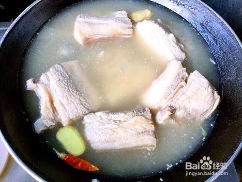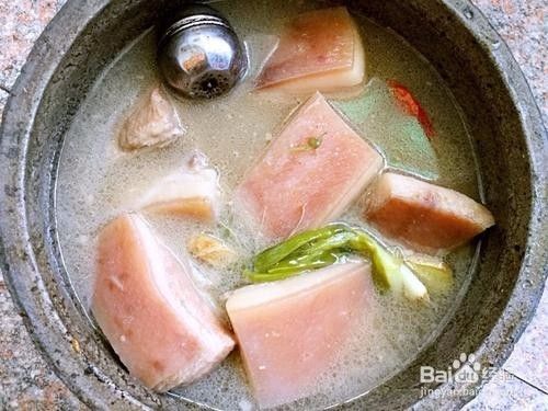 5、煮约三十分钟,用筷子把肉皮扎一下,能扎透肉皮就可以了,放入一勺盐,再煮两三分钟关火。