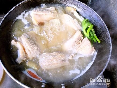 4、水开后,倒入料酒,冰糖放入锅中,盖上锅盖关小火炖。