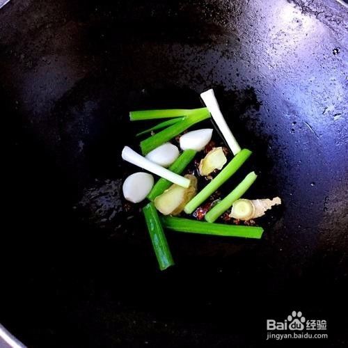 7、炒锅中放适量的油,再次的放花椒大料,葱姜蒜爆香。