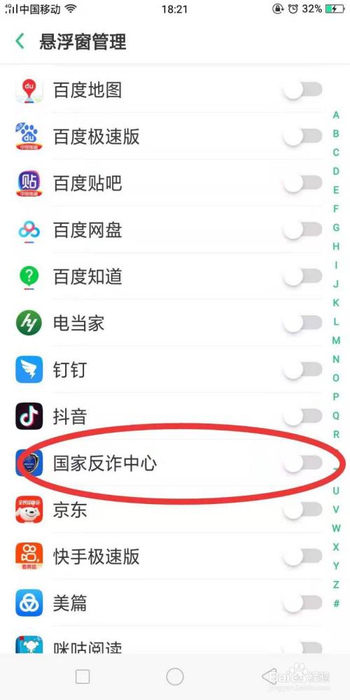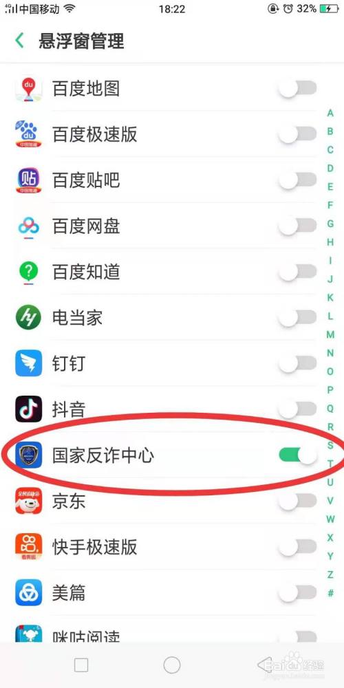 在此页面菜单中找到国家反诈中心。点后面的滚珠,变成绿色。