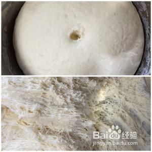 面团发好后,用手指在面团中间戳一个小洞,不回缩,面团内部组织为蜂窝状。 面板上均匀的撒上干面粉,把发好的面团放到案板上按压排气。