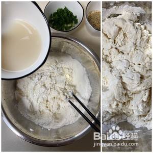 酵母用温水化开,均匀倒入面粉中,边倒边用筷子搅拌。 面粉用筷子搅拌成絮状,然后再用手揉面,这样不会粘手。