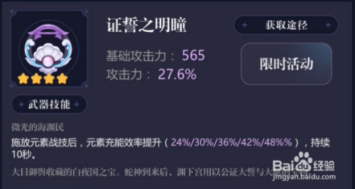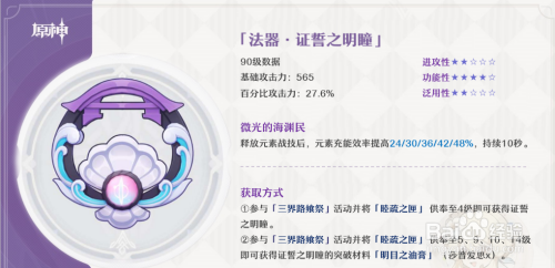 首先,证誓之明瞳在原神里是四星武器,有高基础的攻击而低词条。