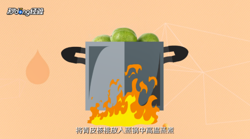 5高温蒸制,将青皮核桃放入蒸锅中高温蒸煮,水开后再蒸煮十分钟,关火后将肯皮核桃倒入冷水中,用手轻轻一剥即可去皮。
