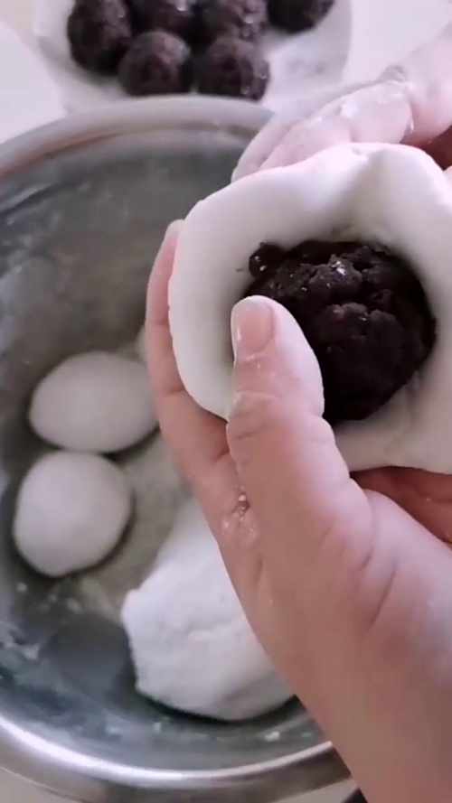 面团压扁裹上红豆馅。