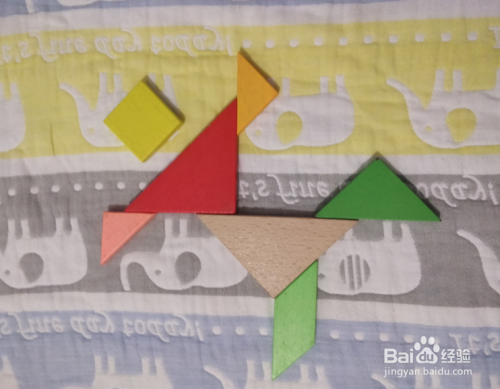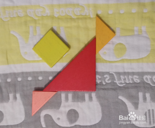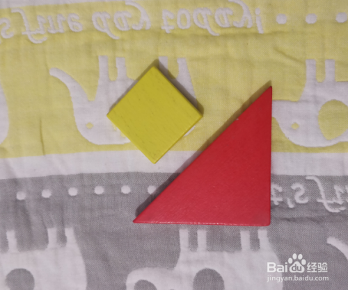 将黄色三角形斜边竖直居于左侧,放在红色三角形的右端上侧,红色右上顶点挨着斜边中点位置。