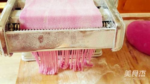 5取一小块面,用压面机压成细面条。没有压面机也可用刀切。