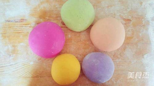 4其他几种果蔬汁用相同的方法分别揉成面团。南瓜泥比其他几种含水量少一些,用90克和200克面。