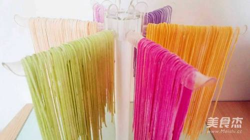 6五种果蔬面分别压成面条,放在凉面架上。面条上要洒一些面粉,防止粘连。一次可以多做一些,挂着晾干,再剪短储存。 果蔬面做法(适合一岁以上宝宝)