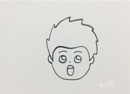 在脸上画出眉毛、眼睛、鼻子、嘴巴。眉毛低两道弯弯的弧线,眼睛圆圆的,鼻子处画一个点,嘴巴也张得大大的