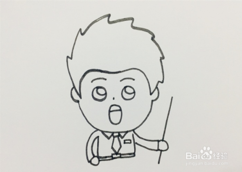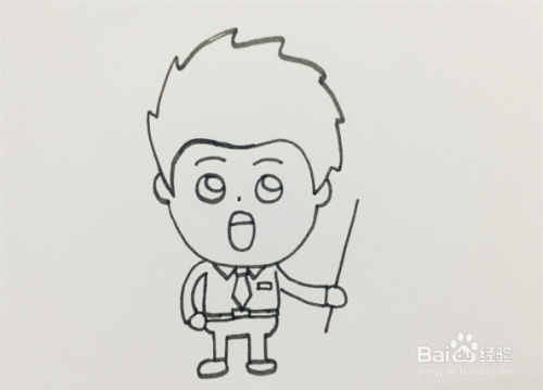 画出人物的上半身,穿着衬衣,系着领带,左手扶腰,右手拿着教鞭