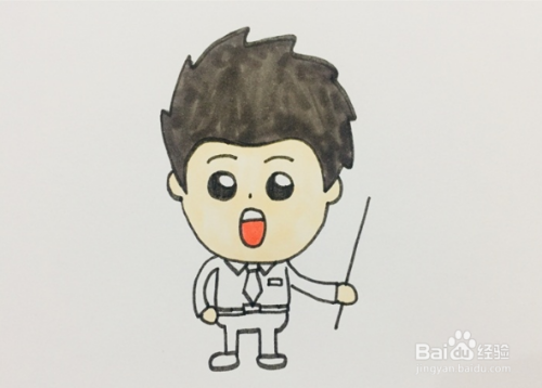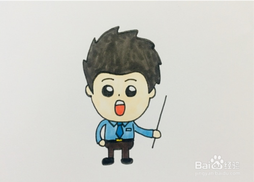 先画出人物头部轮廓,在脸上画出眉毛、眼睛、鼻子、嘴巴,人物穿着衬衣,系着领带,右手拿着教鞭,双腿张开站立,皮肤涂上肤色,眼睛涂黑色,嘴巴涂红色,头发和裤子涂成深棕色,衬衣用浅蓝色,鞋子涂黑色,数学老师就画好了