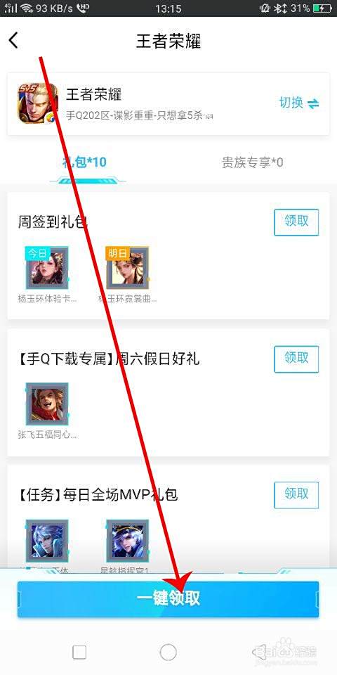 第六步:点击【一键领取】,这样我们就可以领取王者荣耀新手礼包了,如下图所示。