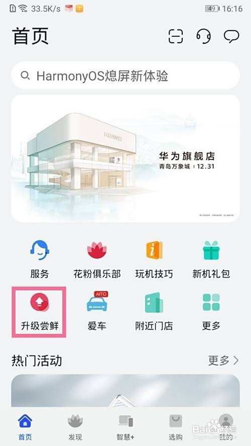 首先打开手机点击进入我的华为APP,找到【升级尝鲜】。