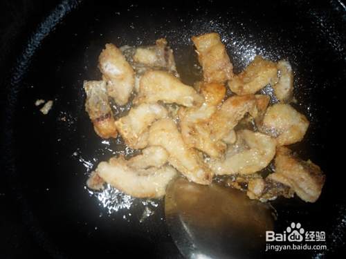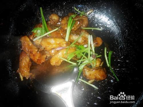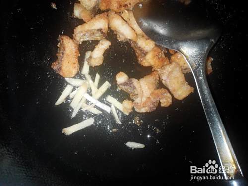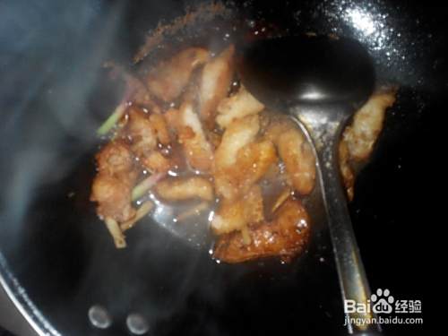倒出多余的油,把鱼块拨到一边,倒入姜丝爆香,如果有花椒的话,也可以放几粒花椒爆香。