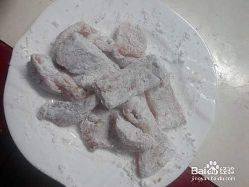腌制好的鱼块,均匀的扑上干淀粉。
