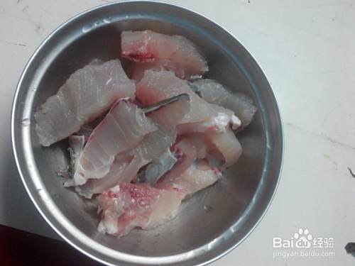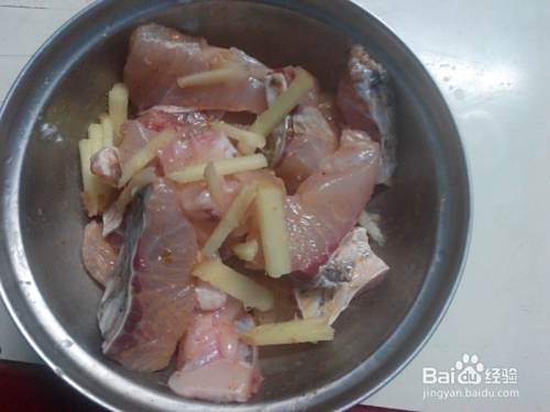 斩好的鱼块,控干水,用适量的盐,五香粉,料酒,姜丝腌制20分钟。