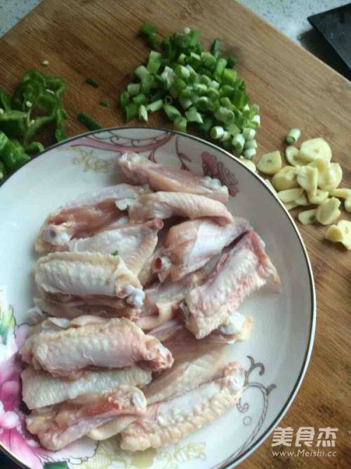 1鸡翅对半切开,葱蒜切丁,辣椒切段