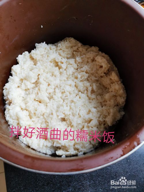 等糯米饭凉了,这里的凉了的意思就是和室温相同或略高于室温。就可以拌酒曲了。甜酒曲用凉开水化开,均匀的洒在糯米饭上,用盛米饭的勺子翻拌均匀,目的是使所有的糯米饭和酒曲混合均匀。