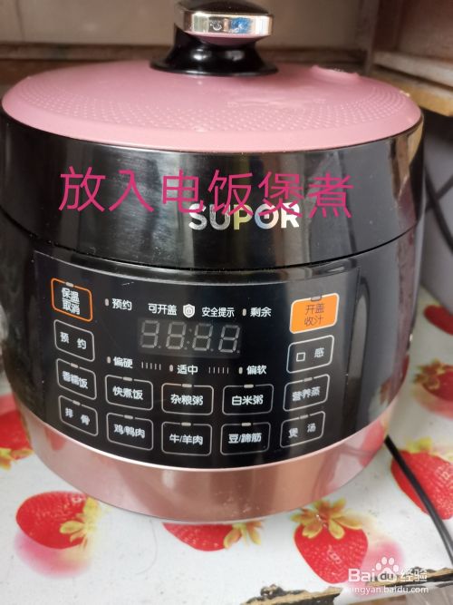 将洗净的糯米放入电饭煲中,加水高出糯米一个半指节即可,因为糯米没有提前泡发,所以水稍微多一点也没有关系,按下煮饭键。我家是高压电饭煲,我选的香糯饭,默认时间是28分钟。