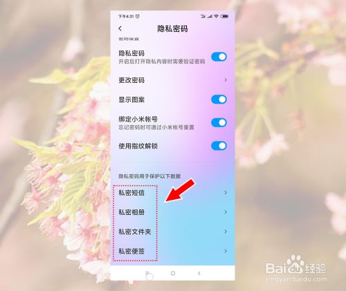 进入隐私密码界面后,下拉就可以看到私密短信、私密相册、私密文件夹、私密便签等,这个大家根据自己情况选择对应想要隐藏的内容,再根据提示设置就好了