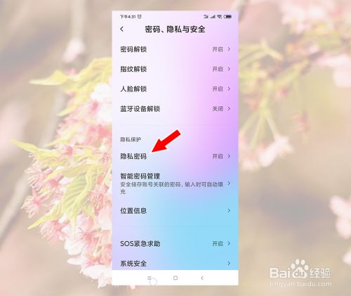 然后在“密码、隐私与安全”界面中找到隐私密码并点击,再输入隐私密码,没有设置隐私密码先根据提示设置隐私密码