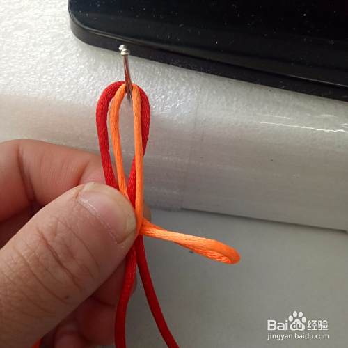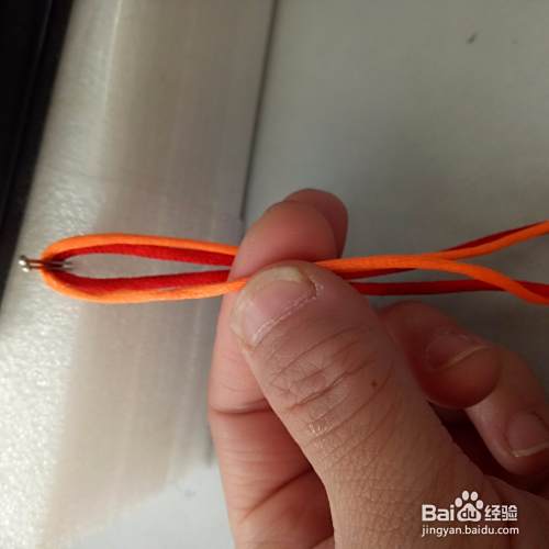 从三根绳 子的上面绕一下,将右边桔色的绳 拉到刚才绕的绳子上面,再从下绕过,从洞中拉出,拉紧就可以了