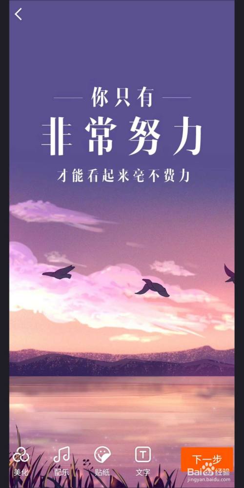 第三步,即时拍摄或选择已经加工好的作品都可以,我选择了已经保存在手机里的图片做例子,此时可以美化,加贴纸,加音乐,点击下一步,如下图所示: