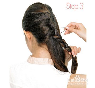 然后以简单三股麻花辫将头发再往下面编一点,发尾用橡皮筋固定一下,然后用黑色小发夹将发辫固定在脑后。