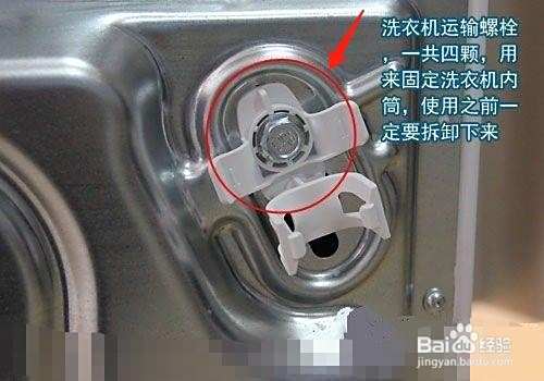 首先寻找你的滚筒洗衣机震动的原因,我的是在甩干时振动超大,整个就像个机器人在蹦动,这种情况是很严重的,应该立即切断电源。立即打电话客服人员咨询,如果你买回来后也没有拆掉4个运输螺栓的话,那肯定是这个问题,运输螺栓位置见如下图: