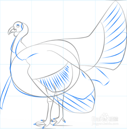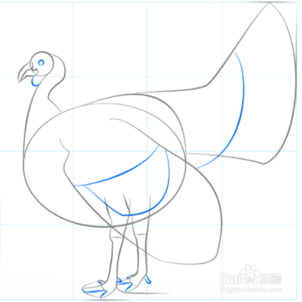 绘制火鸡的翅膀和尾羽的形状。加上眼睛,脚趾。