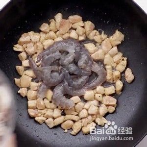 中火加热炒锅,放入油,油热后放入鸡丁炒散,然后放入虾仁和口蘑片,炒到蘑菇变色收缩,然后盛出来。