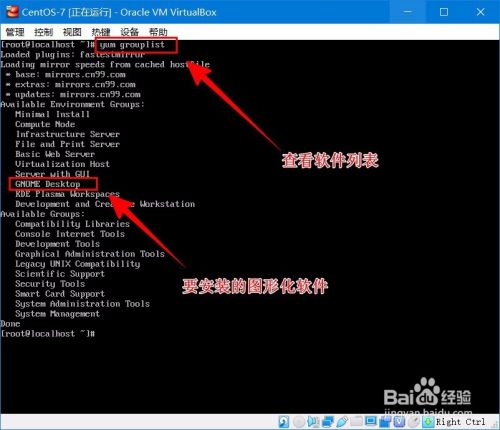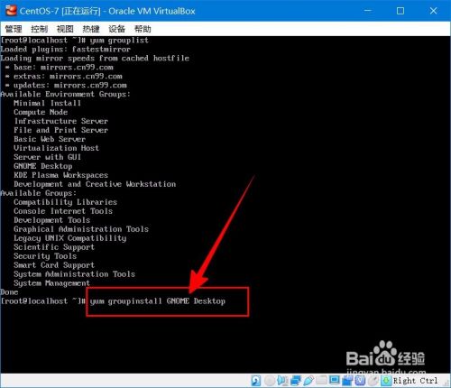 之后输入yum grouplist,查看可安装列表。也能看到“GNOME Desktop”。