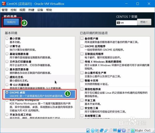 默认安装的基本环境是“最小安装”,这里我们选到“GNOME桌面”,右侧使可以选择安装的附加选项。