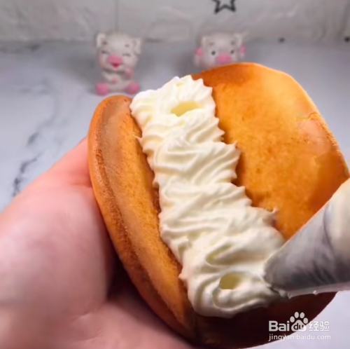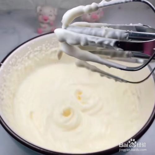 打发奶油:取120克淡奶油,加入10克白砂糖打发,装入裱花袋、备用。