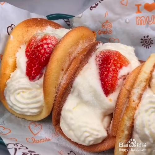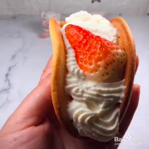 最后把打发好的奶油挤在放凉的小饼上,摆上一片草莓,再挤上一层奶油,再摆上一片草莓。