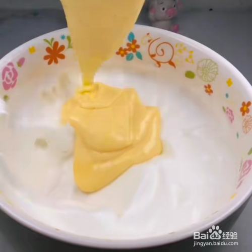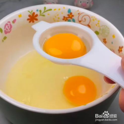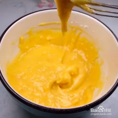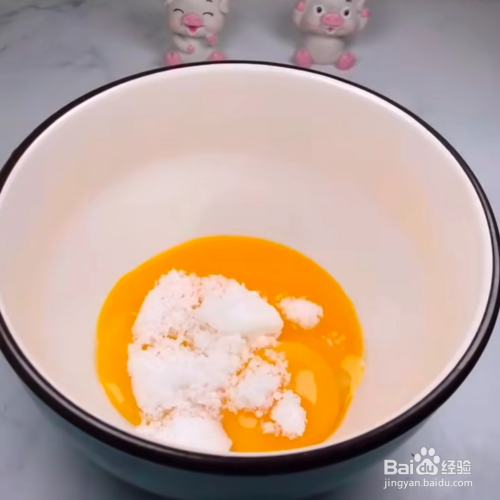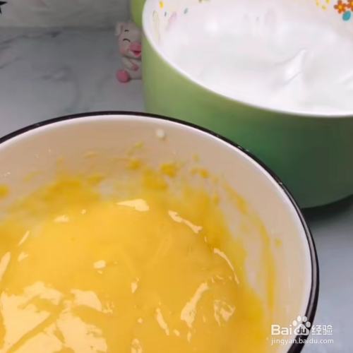先将两个鸡蛋蛋清和蛋黄分离开,蛋黄里加上15克白砂糖,35克牛奶,23克玉米油,搅拌至融化。