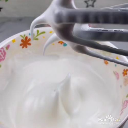接着在蛋清中加上25克白砂糖,中低速打发至有小尖尖。