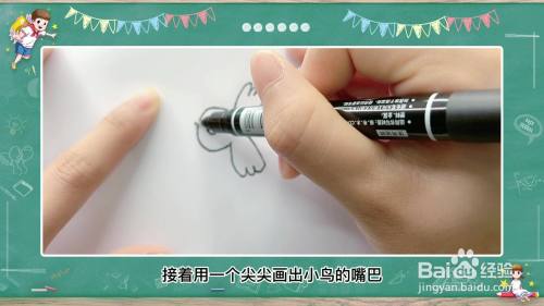 再用一个圆形画出小鸟的鼻子,接着用一个尖尖画出小鸟的嘴巴。