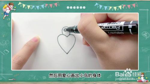 首先用一个半圆画出小鸟的头部,然后用爱心画出小鸟的身体。