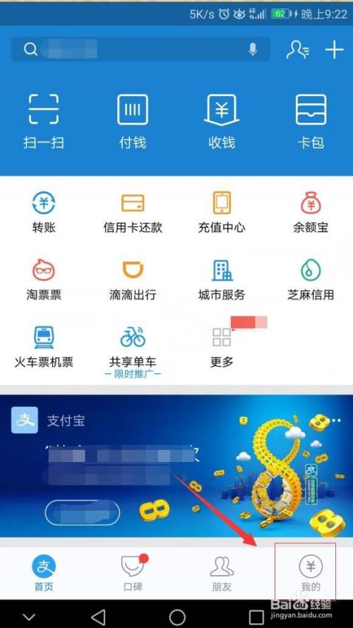 首先,打开手机,接着我们找到支付宝图标,进行打开,进行登录,小编之前登录过了,有记忆功能,就不用登录,直接来到了支付宝首页,在首页,我们点击下方的“我”,如图所示。