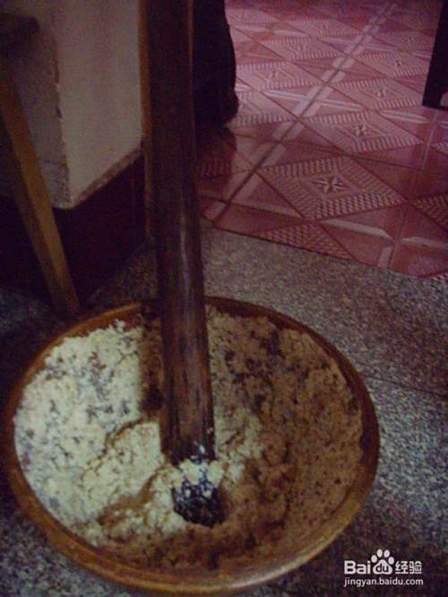 4、好了,接下来我们把炒好的花椒、大米、紫米打碎。用什么打碎好呢?可用木棍和瓦盆来磨碎,当然也可以用机器,不要搅得太碎,颗粒大些就可以。